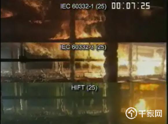 又圖是截取三種線纜的阻燃試驗測試圖,第一種線纜是通過IEC 60332-1標準測試要求的,第二種線纜是通過IEC 60332-3標準測試要求的,第三種線纜是通過HIFT(相當CMP)標準測試要求的。我們可以看到,在7分25秒時,第一種線纜燃起熊熊大火,而且?guī)в袧鉄?第二種線纜也燃起了熊熊大火,只有第三種達到CMP級的線纜,并沒有起火燃燒。