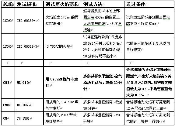 級。反之,即使材料使用了低煙、阻燃PVC加FEP,如達不到上述測試要求,阻燃等級同樣不能說達到CMP級。各種線纜詳細的測試方法及判定條件見下表: