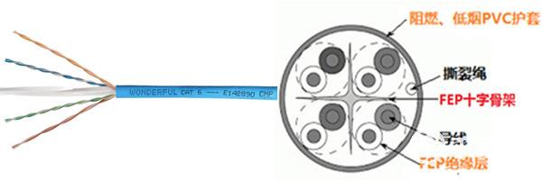 CMP四對雙絞線線纜的產(chǎn)品結(jié)構(gòu),和其它四對雙絞線結(jié)構(gòu)是一樣的。就拿常見的六類雙絞線來看。其結(jié)構(gòu)包括線纜的外護套、線纜中心十字骨架、撕裂繩、芯線的絕緣層,以及8根銅導(dǎo)體。如下圖所示: