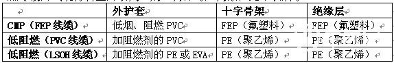 雖然結(jié)構(gòu)一樣,但是組成CMP高阻燃線纜的材料卻和其它阻燃等級的線纜有很大不同(比如常說的PVC線纜和低煙無鹵線纜)。CMP線纜的外護套使用的是專用的低煙、阻燃PVC(聚氯乙烯)材料,而其它低等級的阻燃線纜使用的是普通阻燃PVC材料,亦或是加了阻燃劑的PE(聚乙烯)或EVA(乙烯-醋酸乙烯共聚物)材料。CMP線纜的中心十字骨架采用FEP(氟塑料)材料,而其它低阻燃等級的線纜十字骨架一般采用PE材料。CMP線纜8芯線的絕緣層采用的是FEP材料,而其它低等級阻燃線纜的絕緣層采用的是PE材料,這是CMP線纜和其它阻燃等級的線纜材料上的最大區(qū)別。具體對應(yīng)關(guān)系,見下表所示: